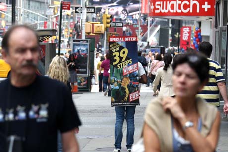 在美國(guó)紐約百老匯大道上有這樣一群人,胸前和身后各背著一塊廣告看板,自己的身子夾在兩塊看板中間,一邊向路人發(fā)放百老匯最新劇目的宣傳單,一邊嘴里還不停地宣傳劇目——人們給了他們一個(gè)很形象的稱呼“夾心廣告”。自經(jīng)濟(jì)不景氣以來,百老匯的“夾心廣告”也越來越多了。 圖為一名“夾心廣告”站在美國(guó)紐約百老匯大道上。