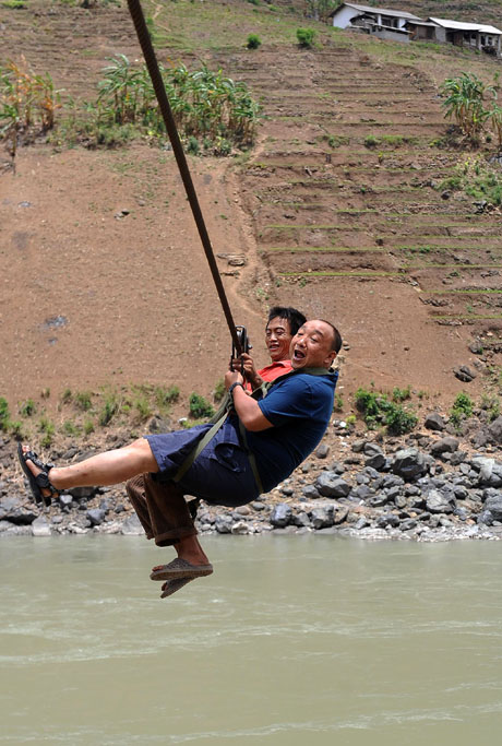 5月24日,一名游客(前)在當(dāng)?shù)厝罕姷呐惆橄略谠颇鲜∨圩遄灾沃轂o水縣境內(nèi)的怒江河谷溜索。 溜索是怒江河谷最具代表性的原始交通工具之一,曾經(jīng)是當(dāng)?shù)厝罕娺^(guò)江的主要方式。如今橫架在怒江上的橋越來(lái)越多,但溜索仍然沒(méi)有退出歷史舞臺(tái)。除在一些偏遠(yuǎn)的高山峽谷地帶,溜索作為交通工具仍然在使用外,現(xiàn)在怒江溜索已經(jīng)成為一種新興旅游項(xiàng)目,越來(lái)越多的海內(nèi)外游客來(lái)到怒江都要體驗(yàn)溜索這種“勇敢者的運(yùn)動(dòng)”,感受凌空飛溜的驚險(xiǎn)與刺激。 |