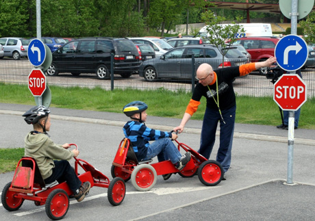 27日,芬蘭首都赫爾辛基“兒童交通城”的工作人員向兒童講解交通規(guī)則。為了從小培養(yǎng)孩子們的交通安全意識,赫爾辛基青少年事務(wù)中心在市中心建立了“兒童交通城”,專門對學(xué)齡前兒童和基礎(chǔ)學(xué)校低年級學(xué)生進行交通安全教育!皟和煌ǔ恰蹦M城市里的各種交通設(shè)施,不僅設(shè)計了各種不同的路段、交叉路口、人行道、自行車道和斑馬線,而且還設(shè)有與實際大小一樣的各種交通標志和交通燈。赫爾辛基地區(qū)幼兒園和學(xué)校的老師可通過電話預(yù)約的方式,帶領(lǐng)孩子們免費來這里接受交通安全教育。 |