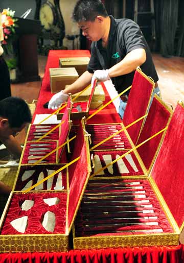 7月14日,工作人員在清點準備移交中國文字博物館的珍貴文物。 當日,河南省征調(diào)文物入藏中國文字博物館儀式在河南省博物院舉行。193件有關(guān)文字的珍貴文物被移交中國文字博物館收藏。 這批移交的文物包括河南博物院院藏“十六年鄭令”戈、銅“部曲將”印、曾子甗等123件文物和河南省文物考古研究所所藏的賈湖龜腹甲刻符、新蔡葛陵楚墓竹簡、溫縣盟書、長子口鼎、薳子昃鼎、平夜君成戈、垂球等不同歷史時期的各門類文物70件。