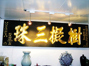 張松國還收藏有官匾、壽匾等不同類型的牌匾。他介紹,牌匾不僅是指示標(biāo)志,更是文化身份的標(biāo)志。歷史上它就廣泛應(yīng)用于宮殿、牌坊、寺廟、商號、民宅等建筑的顯赫位置,向人們傳達(dá)皇權(quán)、文化、人物、信仰、商業(yè)等信息。比如說人們比較熟悉的商業(yè)領(lǐng)域的牌匾,它們往往是通過巧取文學(xué)作品、憑借商聯(lián)文采、援引成語典故、附著神話傳說、名人題字等方式,抓住人們傳統(tǒng)的趨吉心理,以此來表達(dá)店家對客人的報恩情感,同時也顯示店家誠信。一塊有分量的牌匾,能極大提升店家的整體形象。