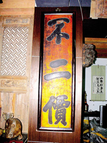 內(nèi)文是飽滿圓潤,柔中帶剛的三個字———“不二價”,匾的面上均勻分布金漆,匾身以名貴的紫檀木包邊,這塊明清時期紫檀邊框“不二價”匾是典型的古代商業(yè)牌匾。光從字面上理解,許多看過這塊匾的人都猜測,過去是放在典當(dāng)鋪里作為鎮(zhèn)店之寶的。如今,這塊匾被藏家張松國所得。當(dāng)初他在一條古玩街上看到這塊老匾的時候,一眼就看出了材質(zhì)上的不凡之處,等店老板開了價便二話不說買走了。此后還多方面查找資料尋找出這塊老匾的來歷,目前已有一些眉目需要進(jìn)一步的證實。這塊老匾,仔細(xì)摸會發(fā)現(xiàn)匾身內(nèi)里似乎夾有東西,估計是紙張文書一類,如果取出來看必定大有發(fā)現(xiàn)。但是,考慮到貿(mào)然動手,會損壞老匾的整體外觀,所以就沒有刻意在其身上尋找證據(jù)。