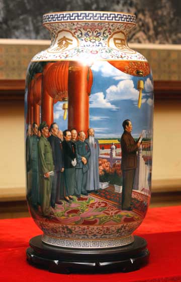 7月20日,江山如此多嬌-新中國(guó)60年華誕國(guó)瓷藝術(shù)展首展在北京全國(guó)政協(xié)禮堂舉行。為慶祝新中國(guó)成立60周年,中國(guó)文物學(xué)會(huì)收藏鑒定委員會(huì)組織景德鎮(zhèn)瓷藝大師創(chuàng)作了以“江山如此多嬌”為主題的系列國(guó)瓷藝術(shù)品。展覽共包括兩件主題創(chuàng)作瓷藝大器“江山如此多嬌”“開(kāi)國(guó)大典”和17件高仿藝術(shù)品。圖為“開(kāi)國(guó)大典”瓷藝大器。 |
