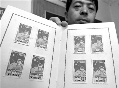 詹洪閣收藏的中華人民共和國開國紀(jì)念郵票,這也是新中國最早期的郵票之一。 遼寧沈陽38歲的民間收藏家詹洪閣收藏了慶祝中華人民共和國開國大典的一系列紀(jì)念品。在新中國成立60周年之際,他會將這一系列收藏紀(jì)念品展出,供人參觀欣賞。