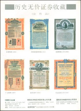 記得1994年夏季的時候,新華社中國圖片社曾經(jīng)計劃出版一套歷史無價證券收藏品,預計全套大約在25~30張之間,由珠海經(jīng)濟特區(qū)拱圖貿易公司代理;這套歷史無價證券收藏品,同時還是香港國際防偽增值科技公司的項目。