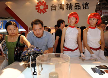 9月9日,正在福建廈門舉行的第十三屆中國國際投資貿(mào)易洽談會(huì)上,觀眾在臺(tái)灣精品館觀看臺(tái)灣制造的富有創(chuàng)意的自行車帽。新華社記者:張國俊
