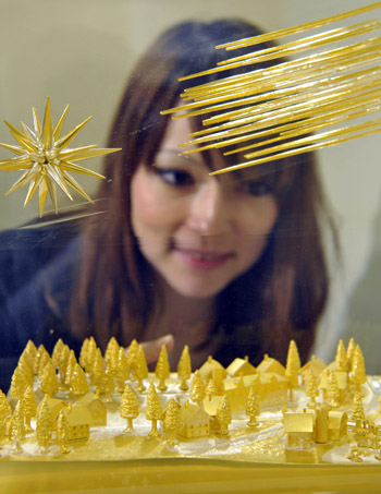 ▲在日本東京舉行的一個(gè)金銀工藝品展覽上,一名女觀眾端詳展品《星語心愿》。這一作品高30厘米,重15千克,由純金制成,市場(chǎng)價(jià)約130萬美元。新華社/法新