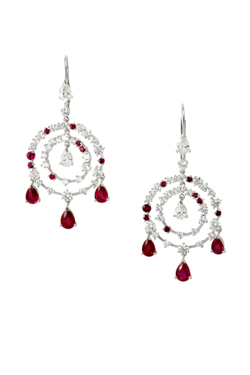 圖為Pétillante針式耳環(huán),以兩個同心寶石圈拼湊出精致造型,一顆炫目的梨形鉆石被無數(shù)碎鉆和不同色調(diào)的紅寶石環(huán)繞著。