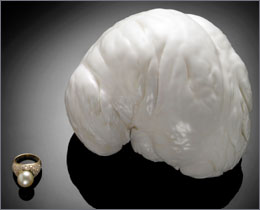 英國寶龍拍賣公司定于12月月6日在美國洛杉磯拍賣一顆重達(dá)2.25公斤的天然珍珠。據(jù)信這是世界上已發(fā)現(xiàn)的第二大珍珠。 寶龍拍賣公司在聲明中說,這顆形狀像人腦樣的珍珠直徑達(dá)15厘米,發(fā)現(xiàn)于菲律賓巴拉望島附近水域,被稱為“巴拉望公主”,據(jù)信重量僅次于重約6.35公斤的另一顆珍珠。 這顆珍珠估價(jià)在30萬到40萬美元之間。歐洲寶石實(shí)驗(yàn)室參與了它的鑒定工作。這家實(shí)驗(yàn)室的寶石學(xué)家米奇·賈科博維奇說:“這是我們見過的最大珍珠之一,人們一生只有一次機(jī)會(huì)看這種自然界獨(dú)特的珍寶! 拍賣會(huì)將在洛杉磯自然歷史博物館舉行,與這顆珍珠一起拍賣的還有孕育它的蚌殼的下半部分。