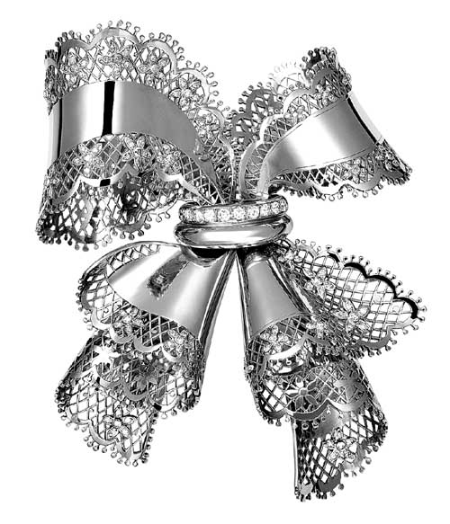 蝴蝶結(jié)是高級訂制時裝的基本裝飾元素,長久以來也是法國珠寶品牌梵克雅寶優(yōu)美傳統(tǒng)的組成部分。無論簡單還是復(fù)雜,蝴蝶結(jié)都以其獨具的立體美感襯托出女性雍容的美態(tài)。布料和珠寶相互幻化難分彼此,精巧的手工甚至令L ace胸針透現(xiàn)柔麗肌膚。這枚于1945年創(chuàng)作的黃金蝴蝶結(jié),飾有黃金蕾絲花邊,綴飾的鉆石小花更顯精巧工藝。