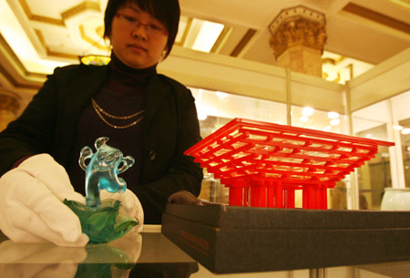 1月5日,工作人員展示上海世博會(huì)中國(guó)館水晶模型和琉璃“海寶”。 當(dāng)日,將在上海2010年“藍(lán)天下的至愛(ài)——‘點(diǎn)亮心愿’慈善義拍”上拍賣(mài)的近百件拍品對(duì)公眾開(kāi)放預(yù)展,其中包括琉璃“海寶”、世博會(huì)中國(guó)館水晶模型和姚明親筆簽名的籃球等。上!包c(diǎn)亮心愿”慈善義拍是一項(xiàng)面向社會(huì)征集拍品拍賣(mài)以救助貧困患者的慈善項(xiàng)目,自2000年發(fā)起至今已舉辦10屆。新華社發(fā) |