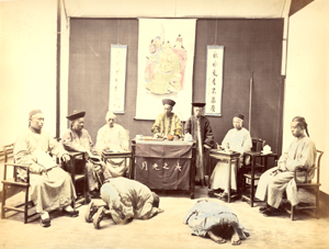 威廉·桑德斯的《法庭》。英國商業(yè)攝影師威廉·桑德斯1862-1887年在上海開設(shè)照相館,《法庭》是他安排模特“再現(xiàn)”中國社會的場景和風俗習慣,拍攝照片,用作商品銷售,是中國最早的將概念視覺化的攝影家。威廉·桑德斯拍攝的場景照和攝影室肖像是中國影像史上重要的藏品。目前中國市場上的參考價格為6000-10000元。