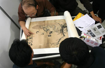 裝裱作偽也是關(guān)系到一幅造假字畫成敗之關(guān)鍵。 一幅臨摹的贗品字畫弄好后蓋上假章提上假款,就開始進入最后一道程序,就是對字畫進行“做舊”裝裱處理。在內(nèi)地某仿古字畫街上,筆者親眼目睹了裝裱字畫的全過程。 他們所使用的紙張作偽原理也很簡單,即用煙熏、吸潮、茶葉水、促霉等方法使成品表面讓人在觀看、鼻聞、手摸時都能產(chǎn)生古舊的感覺,把偽作保存在放了很多樟腦丸的樟木箱內(nèi)數(shù)日就成。 之后再把成品故意做成十分破損,有的在字畫后面還涂上一些黃泥狀物,給人的感覺就像是拆舊房時從墻上取下來的,有的上面還有很多像針尖一樣的“蟲眼”,讓人一眼看去,這幅字畫就是很久很久以前從前幾輩人那里留傳下來的“古董字畫”。如本人購得一幅齊白石的“蝦”,就是如此裝裱造假的。 這里的造假不背人。老板說,假造的程度你看著達到滿意為止,哪點兒不像,繼續(xù)加工運作,直到買方滿意為止。另外,還有大批量的瓷器、青銅器造假也是當(dāng)著眾人的面明目張膽地進行。正如老板所言,“我們造假得到的利潤很薄,只要有利就賣,一幅偽作只要能從中賺個10元、8元就可以了,所以每天全國各地的文物販子都會光臨我們這仿古一條街! 字畫造假的手段還有許多。奉勸那些真正喜愛字畫的收藏投資者,不妨多到外邊走走看看,這樣既可開闊眼界,提高鑒賞的水平,又能做到防止上當(dāng)受騙,從而減少每每交了“學(xué)費”后悔不已的心情。 |