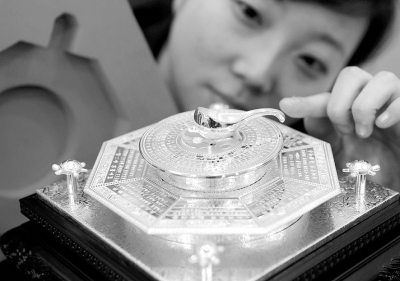 2月8日,北京菜百的工作人員在展示“和合盤”。 當日,一款名為“和合盤”的黃金工藝品在北京菜市口百貨商場正式上市銷售。該作品由古代司南、周易羅盤和八角盤等古代經(jīng)典視覺符號構成,兼具收藏和投資價值。