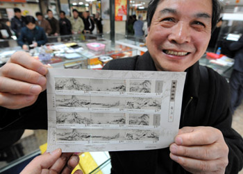 在南京鼓樓郵政大樓,一位市民展示剛剛買到的《富春山居圖》特種郵票。新華社記者 孫參/攝