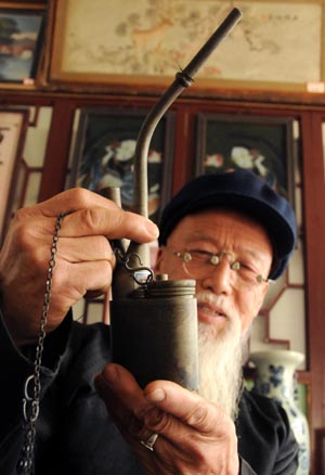 3月21日,在河北永清縣李莊子村,李贏老人正在把玩他收藏的一個(gè)水煙壺。李贏是河北省永清縣李莊子村一名普通農(nóng)民,他花費(fèi)幾十年時(shí)間收藏了涉及瓷器、陶器、銅器、木器等幾十類共4000多件藏品,并在自家庭院中建起了民俗博物館,吸引了鄉(xiāng)鄰和眾多外地游客前來參觀。