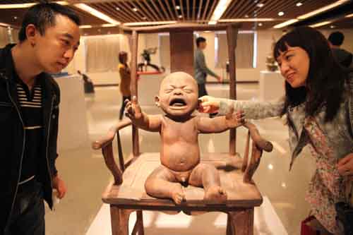 日前,為期5個月的國粹苑·國粹藝術(shù)“銀行”全球創(chuàng)意節(jié)在北京開幕,眾多價值連城的收藏品集中亮相,期間將舉行盛世中華收藏展、中外藝術(shù)學院優(yōu)秀雕塑作品展、第十六屆國際雕塑論壇、“意大利、法國、日本、韓國”四國國際藝術(shù)展等一系列活動。 圖為在北京舉行的國粹藝術(shù)“銀行”全球創(chuàng)意節(jié)上,一組雕塑作品吸引了兩名參觀者的目光。新華社發(fā)