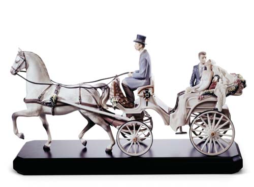 雅致(LLADRO)的華貴瓷藝是歷年來雅致作品中最具藝術(shù)表達力的一個系列。該系列中作品“新娘馬車”最令人嘆為觀止之處在于它完全不依靠其他支撐點或陶瓷底座,僅靠三條馬腿和四個輪子支撐重量。此外,這件作品對于細節(jié)的刻畫極盡精致唯美。新娘雍容華貴的婚紗上刺繡著精致的花紋、長長的裙擺間微微的褶皺、頭發(fā)后飄散的精美長披巾,以及裙擺下微露的繡花花邊均是雅致精湛瓷藝的呈現(xiàn)。
