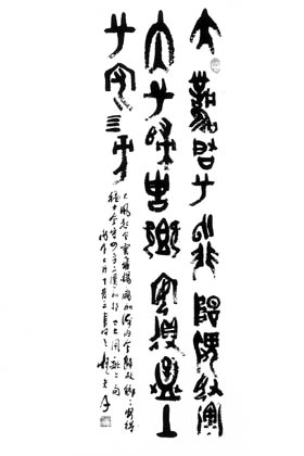 在上海世博會上,他的甲骨文鐫中國紅鈺瓷巨型寶瓶和絲繡甲骨文藝術(shù)長卷向來自世界各地的游客展示中國古老文字的魅力;在海外,他因?qū)懸饧坠俏亩蛔u為“龍”先生,其作品被海內(nèi)外許多名家學(xué)者企業(yè)家收藏。他就是著名的甲骨文書法藝術(shù)大師——“怪夫子”宋大海。 宋大海的寫意“龍”字甲骨文在海外華人圈中有口皆碑,凡是看到他書寫的“龍”字的人,無不為之振奮。在這位“怪夫子”的筆下,龍在騰云駕霧,龍在長空飛舞,龍之精神、龍之豪邁、龍之雄威、龍之氣勢無不躍然其間,龍駕雄風(fēng)乘萬里之志,龍有躍長空攀凌云之功。有人評價說:“‘怪夫子’筆勢千變?nèi)f化,筆力遒勁蒼郁,有時瀟灑飄逸,有時行若云浮,有時力拔千鈞、粗獷委婉,搭配相宜,起筆與落筆結(jié)構(gòu)得體,有若行云流水,有若虹開雨霽,他把龍的精神、氣魄、風(fēng)骨、形態(tài)書寫得巧妙無比。” 能將甲骨文藝術(shù)書到如此境界,“怪夫子”的甲骨文書法文化底蘊可謂非常豐厚,而這種積淀又源于他60余年的專心研究。不論在何種艱苦的條件下,“怪夫子”都從未間斷過對甲骨文的研究。 “讀萬卷書,行萬里路”。幾十年來,“怪夫子”一直在故紙堆中探尋甲骨文的真諦,他的足跡不僅遍布中華大地,甚至還涉及非洲的一些民族部落。他曾數(shù)十次赴甲骨文的誕生地河南安陽殷墟,他還親自到非洲體驗造字環(huán)境,試圖與幾千年前的古人類對話、同悠久的中華民族歷史對話、同非洲原始的部落民族對話。60載的苦心研習(xí),讓如今的“怪夫子”對甲骨分期斷代、文字釋考、卜法文例等關(guān)鍵學(xué)術(shù)課題有了深入認(rèn)識。 作為目前已知的我國古代文字中時代最早、體系較為完整的文字,甲骨文一直以來都帶著一種神秘色彩,不過宋大海與甲骨文的緣分卻很早就開始了。在談到自己的經(jīng)歷時,他曾表示:“自幼,我就很喜歡中國古文化,特別是古文字。在我幼小心靈里就扎下了這么一個深深的根。開始只是興趣,當(dāng)然,興趣是成功的起點。我七歲就開始習(xí)古了,先是跟著祖父、舅舅學(xué)古文字,跟著他們跑,他們當(dāng)時是鄉(xiāng)間的秀才。久而久之,學(xué)習(xí)研究古文字的興趣就實在割舍不下了。在當(dāng)時,我幼小心靈里總覺得這些都是祖宗留下來的最寶貴的東西,不能把它扔進海里漂沒了。祖宗創(chuàng)造出的東西,必定是有他的道理。長輩們告訴我,這些東西是中國獨有的,哪個國家都沒有。由此,我就更加酷愛對古文字的研究了。” 在研習(xí)甲骨文字知識時,宋大海還得到了當(dāng)時的中國社會科學(xué)院院長、著名甲骨文專家郭沫若的指導(dǎo)。 大二那年,宋大海給郭沫若寫了一封信,希望能得指教。在信中,宋大海還寫了十幾個甲骨文。不久后,他收到了郭沫若的回信:“鍥而不舍,必有大進”。自此后,宋大海便常常把自己的習(xí)作寄給郭沫若,請他指導(dǎo)。有時他還會到郭沫若的辦公室,親耳聆聽郭老的教誨。郭沫若除了教給他古文字學(xué)之外,還教了他一個“變”字。郭沫若曾對他說,世上任何事物都在變化發(fā)展,研究甲骨文也一樣,不能只停留在發(fā)現(xiàn)與研究上。這種求“變”的思想一直影響著宋大海的古文字研究,是他進行寫意甲骨文創(chuàng)作的原始動力。 |