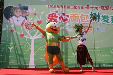 7月2日,作為前期預(yù)熱的北京愛(ài)心傳遞活動(dòng)拉開(kāi)帷幕。當(dāng)日,北京呼家樓中心小學(xué)五年級(jí)的孩子們像過(guò)節(jié)一樣高興,他們的好朋友——“面包人”小愛(ài)來(lái)到他們身旁,把千余個(gè)精致可愛(ài)的面包造型的零錢(qián)包送到了孩子手中。而在小學(xué)操場(chǎng)中央,巨型大字拼成的“捐一元·獻(xiàn)愛(ài)心·送營(yíng)養(yǎng)”活動(dòng)主題特別引人注目,特別是“愛(ài)心”兩個(gè)字,由小學(xué)生們用一千個(gè)紅色愛(ài)心氣球組合而成;顒(dòng)開(kāi)始,氣球帶著孩子們的愛(ài)心、希望和祝福,飛上天空。