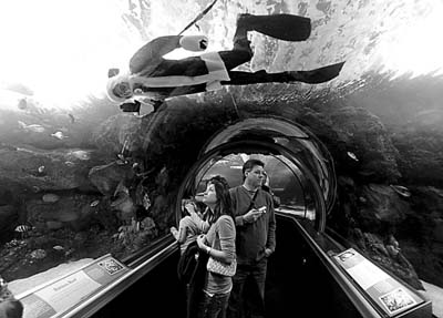 23日,在美國(guó)明尼蘇達(dá)州布盧明頓的一個(gè)購(gòu)物中心水族館,身穿圣誕老人服裝的湯姆·哈格隆德(上)在水中向游客問好。這已經(jīng)是哈格隆德第四年裝扮成“水下圣誕老人”向來此游覽購(gòu)物的市民問好。