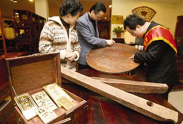 22日,北京紅木企業(yè)元亨利在紅木大觀樓擺出整盒的金條,征集散舊海南黃花梨木家什,只要通過(guò)專(zhuān)家鑒定是海南黃花梨木,哪怕是搟面杖、舊鍋蓋、瘸腿凳子都可換金子。1公斤黃花梨木最高能換40克黃金,價(jià)值約6800元。 工作人員介紹,按木料橫截面面積的大小,把木料分為3個(gè)等級(jí),最高等級(jí)的木料,1公斤約能換40克黃金,按照每克黃金170元計(jì)算,相當(dāng)于6800元。 元亨利總經(jīng)理?xiàng)畈ń榻B,自去年以來(lái),紅木原料告急,價(jià)格翻番,每噸大料收購(gòu)價(jià)高達(dá)上千萬(wàn)元。公司數(shù)次去海南淘料都空手而歸,目前只能試試看在北京能不能收一些零散的黃花梨木料,如果收不上來(lái),今后主產(chǎn)黃花梨家具的元亨利將面臨無(wú)米下鍋的境地。不過(guò)他提醒說(shuō):“不是啥木頭都能換,我只要海南黃花梨!