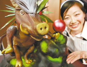 1月23日,在日本東京一個商場舉行的巧克力展上,一名售貨員在向新聞記者介紹用巧克力做的35公斤重的野豬。將于24日開幕的此次巧克力展吸引了來自13個國家和地區(qū)的60個品牌的產(chǎn)品參展。該展覽將持續(xù)到情人節(jié)。
