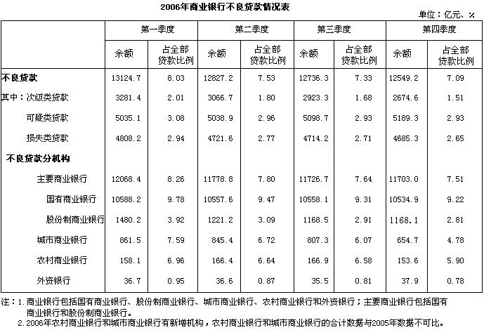 銀監(jiān)會:2006年商業(yè)銀行不良貸款情況