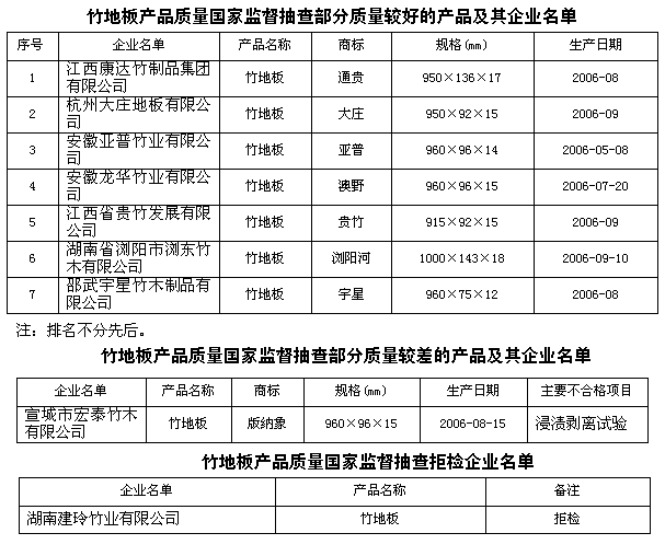 為保障室內(nèi)裝飾裝修材料產(chǎn)品質(zhì)量,維護廣大消費者的合法權(quán)益,促進行業(yè)健康發(fā)展,國家質(zhì)檢總局對竹地板產(chǎn)品質(zhì)量進行了國家監(jiān)督抽查,共抽查了浙江、福建、湖南、安徽、江西等5個省50家企業(yè)生產(chǎn)的50種產(chǎn)品,產(chǎn)品抽樣合格率為94%。檢驗的理化指標甲醛釋放量、靜曲強度、硬度、表面漆膜耐污染性、表面漆膜附著力項目全部符合標準的規(guī)定。
