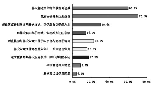 綜上所述,居民不愿意給寵物犬登記,相當(dāng)一部分原因是出于對(duì)目前管理制度有些看法。調(diào)查發(fā)現(xiàn),居民贊同的寵物犬管理辦法中,免費(fèi)強(qiáng)制注射疫苗、養(yǎng)犬超過3年且每年收費(fèi)遞減,是提及率最高的兩個(gè),分別為70.9%和60.2%。這再一次強(qiáng)調(diào)了居民“降低收費(fèi)、獲得服務(wù)”的愿望。 值得注意的是,居民對(duì)養(yǎng)犬自治(鄰居自覺管理、養(yǎng)犬俱樂部)、政府管理優(yōu)化(工作人員培訓(xùn)、管理工作移交城管)都表現(xiàn)出了較大的熱情,同時(shí)他們還希望通過市場(chǎng)機(jī)制獲得更好的養(yǎng)犬服務(wù)。 寵物犬管理是城市管理工作中的一個(gè)難點(diǎn),各個(gè)城市和國(guó)家均要根據(jù)自己的情況出臺(tái)各有特色的管理辦法。在狗身上植入“電子身份證”是目前寵物犬管理中的一項(xiàng)先進(jìn)管理技術(shù),但不論技術(shù)多先進(jìn),最首要的事還是促使居民能夠主動(dòng)為寵物上戶口,只有將寵物犬納入規(guī)范管理軌道,其他相應(yīng)的管理措施才能成行。因此,如何提高養(yǎng)犬居民的注冊(cè)意識(shí),才是各城市制定和調(diào)整養(yǎng)犬政策時(shí)應(yīng)當(dāng)首先考慮的。 寵物犬上戶口后期望應(yīng)享的權(quán)益和服務(wù)
