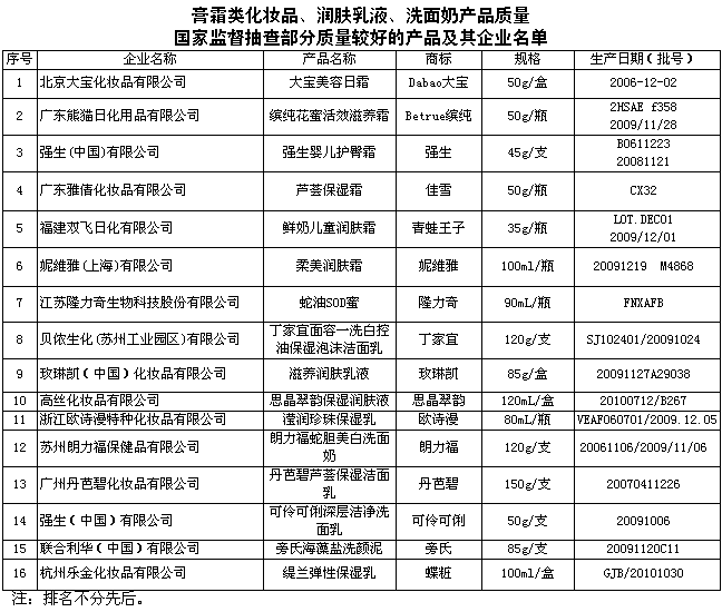 本次對潤膚乳液、洗面奶共抽查了北京、吉林、上海、浙江、江蘇、廣東、安徽等7個省、直轄市36家企業(yè)生產(chǎn)的60種產(chǎn)品,產(chǎn)品抽樣合格率為100%。