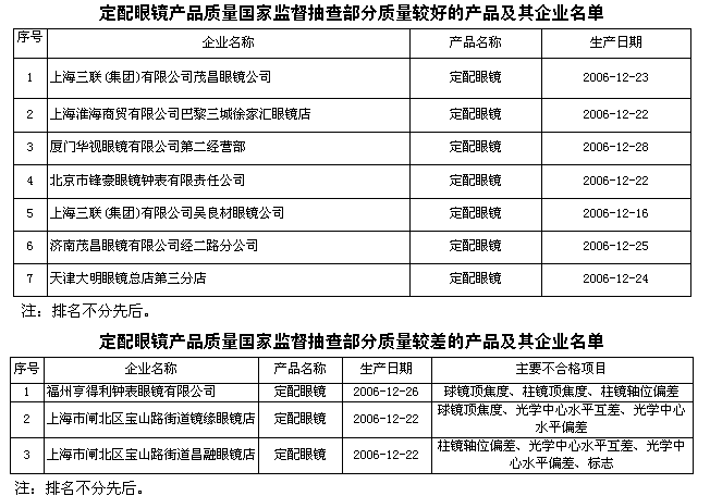 為維護(hù)消費者的合法權(quán)益,促進(jìn)定配眼鏡行業(yè)健康發(fā)展,國家質(zhì)檢總局組織對定配眼鏡產(chǎn)品質(zhì)量進(jìn)行了國家監(jiān)督抽查。共抽查了北京、天津、上海、江蘇、河南、福建、山東等7個省、直轄市99家生產(chǎn)企業(yè)的99種產(chǎn)品,產(chǎn)品抽樣合格率為86.9%。自2000年起已連續(xù)8次對定配眼鏡產(chǎn)品質(zhì)量進(jìn)行了跟蹤抽查,促進(jìn)了產(chǎn)品質(zhì)量的不斷提高。