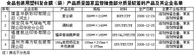 抽查中發(fā)現(xiàn)的主要質(zhì)量問(wèn)題是有部分產(chǎn)品溶劑殘留總量和苯系溶劑殘留量不合格。國(guó)家標(biāo)準(zhǔn)規(guī)定食品包裝用塑料復(fù)合膜(袋)產(chǎn)品中溶劑殘留總量≤10mg/m2,苯系溶劑殘留量≤2mg/m2。溶劑殘留總量和苯系溶劑殘留量是反映成品包裝膜、袋中殘存的溶劑量。