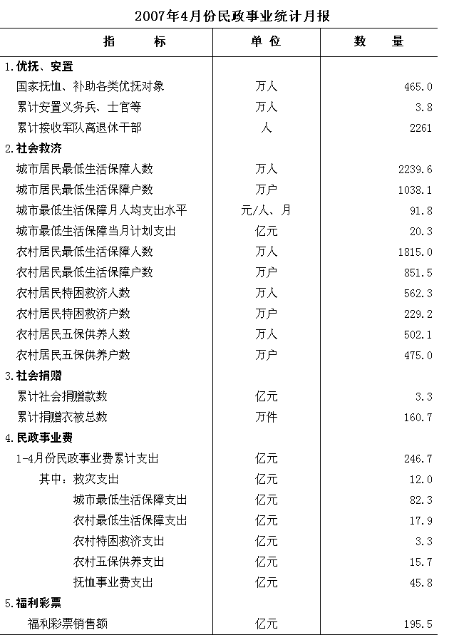 民政部公布4月份民政事業(yè)統(tǒng)計(jì)數(shù)據(jù)