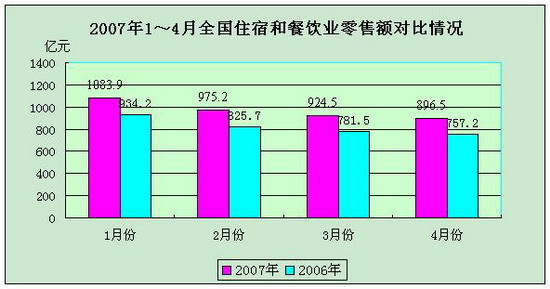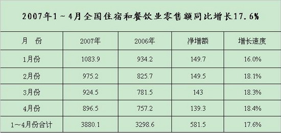 商務(wù)部商業(yè)改革司根據(jù)有關(guān)數(shù)據(jù)分析,今年4月份,全國住宿與餐飲業(yè)零售額實現(xiàn)896.5億元,同比增長18.4%。今年1-4月份,全國住宿與餐飲業(yè)零售額累計實現(xiàn)3880.1億元,同比增長17.6%,比去年同期增幅高出3.1個百分點,占社會消費品零售總額的比重達到13.9%,拉動社會消費品零售總額增長2.4個百分點,對社會消費品零售總額的增長貢獻率為15.9%。