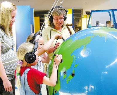 5月27日,在芬蘭首都赫爾辛基市附近的赫尤里卡科學中心主展廳的地球儀旁,芬蘭兒童頭帶耳機,將耳機插頭插在地球儀不同的地區(qū),可以聽到世界各地60種語言的問候。赫尤里卡科學中心是一個深受芬蘭兒童歡迎的科技館。它通過其設計新穎、富有哲理的展品對兒童進行深入淺出、寓教于樂的科普教育,激發(fā)他們對科學的興趣。
