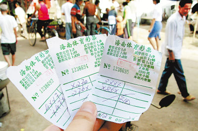 6月12日,在海南省定安縣解放路上,“私彩”攤販出售彩票。該縣最繁華的解放路及附近農(nóng)貿(mào)市場,聚集了幾十家“私彩”攤販。“私彩”泛濫屢禁不絕,其中一個(gè)重要原因是當(dāng)?shù)貙?duì)“私彩”打擊的行政管理仍然缺位。