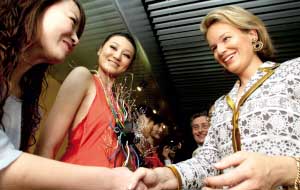 當(dāng)天,瑪?shù)贍柕挠H臨北京服裝學(xué)院,會(huì)見(jiàn)了2007安特衛(wèi)普HRD大賽(一項(xiàng)國(guó)際鉆石設(shè)計(jì)大賽)中國(guó)入圍者并參觀其入圍作品。據(jù)了解,中國(guó)8件入圍作品中有6件出自北服在校學(xué)生之手。