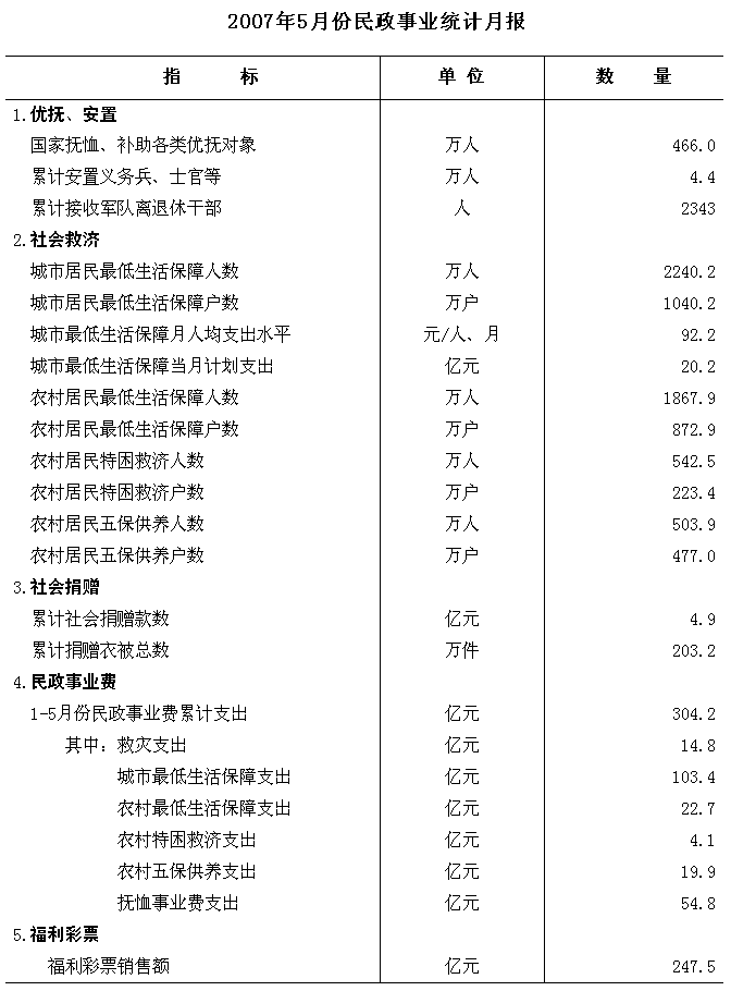 民政部公布五月份民政事業(yè)統(tǒng)計(jì)數(shù)據(jù)
