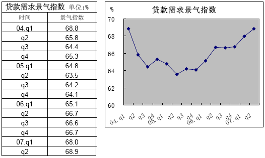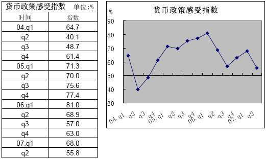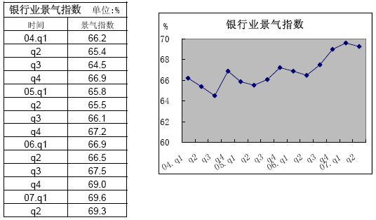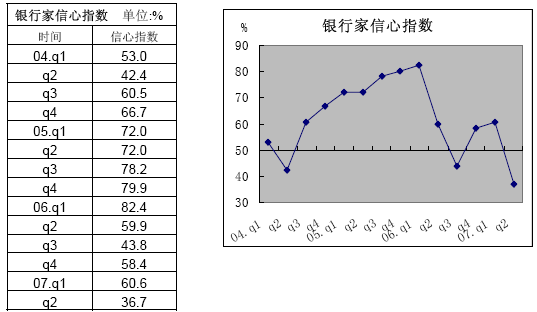 2007年第2季度,由中國人民銀行和國家統(tǒng)計(jì)局共同完成的全國銀行家問卷調(diào)查顯示:銀行家信心指數(shù)降至歷史最低,對未來宏觀經(jīng)濟(jì)走勢預(yù)期不樂觀;銀行業(yè)景氣指數(shù)季節(jié)性回落,銀行財(cái)務(wù)狀況良好,盈利面擴(kuò)大,銀行業(yè)經(jīng)營狀況良好。