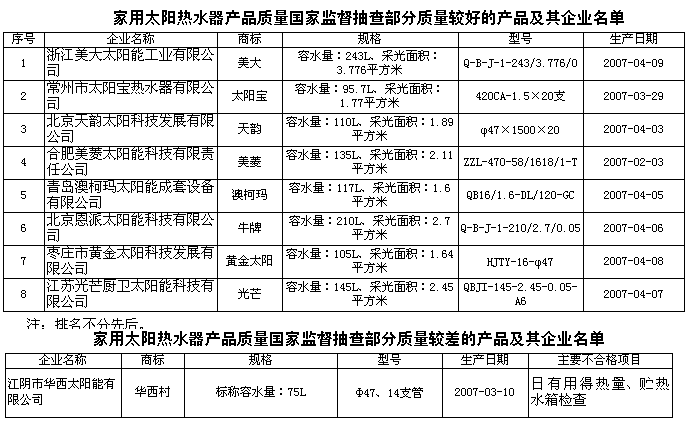 18708-2002《家用太陽熱水系統(tǒng)熱性能試驗方法》及相應(yīng)產(chǎn)品標準的要求,對家用太陽熱水器的熱性能、淋雨、耐壓、支架強度、支架剛度、貯熱水箱、冷態(tài)泄漏電流、電氣強度、接地電阻、過熱保護、安全裝置及外觀等12個項目進行檢驗。 抽查結(jié)果表明,大型生產(chǎn)企業(yè)的產(chǎn)品抽樣合格率為100%,產(chǎn)品質(zhì)量較好。而部分中小型生產(chǎn)企業(yè)產(chǎn)品存在一些質(zhì)量問題。 抽查中發(fā)現(xiàn)的主要質(zhì)量問題: 1、部分產(chǎn)品日有用得熱量不合格。日有用得熱量是表示家用太陽熱水器吸收、轉(zhuǎn)換太陽光能的能力的參數(shù)。日有用得熱量高,家用太陽熱水器提供的熱水就越多,溫度也越高。國家推薦性標準GB/T19141-2003《家用太陽熱水系統(tǒng)技術(shù)條件》規(guī)定,緊湊式家用太陽熱水器日有用得熱量不小于7.5