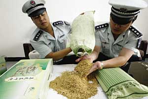 昨天(27日)上午,北京市宣武牛街城管在菜市口南街路邊發(fā)現(xiàn)一名賣茶葉藥枕的小販,打開枕頭一看,里面其實(shí)是蕎麥殼。城管隊員當(dāng)場沒收了小販?zhǔn)圪u的8個藥枕。