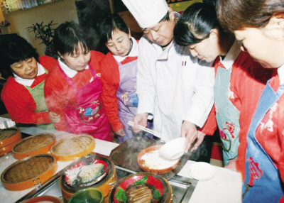 據(jù)民政部門(mén)家政服務(wù)中心介紹,今年“金豬寶寶”扎堆,月嫂吃香,而寶寶家庭對(duì)月嫂業(yè)務(wù)能力要求普遍提高,不僅要求能干,還要求技術(shù)科學(xué),例如最基本的做飯,家庭除要求可口之外,更多提出要保證營(yíng)養(yǎng)。圖為月嫂在專(zhuān)業(yè)蒸菜大廚的指導(dǎo)下學(xué)習(xí)蒸菜烹飪。 |