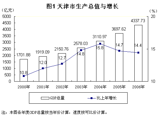 2006年是“十一五”發(fā)展的第一年。全市人民在市委、市政府的正確領(lǐng)導(dǎo)下,以鄧小平理論和“三個(gè)代表”重要思想為指導(dǎo),以科學(xué)發(fā)展觀為統(tǒng)領(lǐng),認(rèn)真貫徹落實(shí)黨中央、國(guó)務(wù)院關(guān)于加快推進(jìn)濱海新區(qū)開發(fā)開放的決定和各項(xiàng)部署,扎實(shí)推進(jìn)“三步走”戰(zhàn)略和五大戰(zhàn)略舉措,加快經(jīng)濟(jì)增長(zhǎng)方式轉(zhuǎn)變,全面推進(jìn)和諧天津建設(shè),全市經(jīng)濟(jì)平穩(wěn)快速增長(zhǎng),效益質(zhì)量進(jìn)一步提高,各項(xiàng)社會(huì)事業(yè)全面發(fā)展,人民生活水平繼續(xù)提高,實(shí)現(xiàn)了“十一五”良好開局。