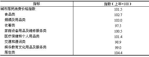 格 城市居民消費(fèi)價(jià)格指數(shù)為101.5,即比上年上漲1.5%。八大類價(jià)格呈現(xiàn)五升三降格局(見表1)。