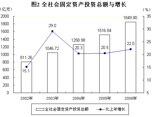 城市商品零售價(jià)格指數(shù)為100.4。工業(yè)品出廠價(jià)格指數(shù)為100.6。原材料燃料及動(dòng)力購(gòu)進(jìn)價(jià)格指數(shù)為104.7。房屋銷售價(jià)格指數(shù)為106.7,其中商品住宅價(jià)格指數(shù)為107.1。 固定資產(chǎn)投資 全社會(huì)固定資產(chǎn)投資完成1849.80億元,比上年增長(zhǎng)22.0%(見圖2)。其中,城鎮(zhèn)固定資產(chǎn)投資1709.66億元,增長(zhǎng)23.4%;農(nóng)村固定資產(chǎn)投資140.14億元,增長(zhǎng)6.9%。