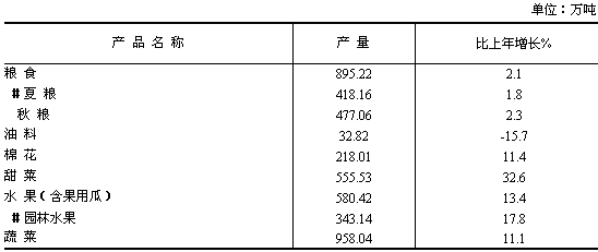全年農林牧漁業(yè)總產值883.54億元,比上年增長7.5%。其中,農業(yè)產值638.60億元,增長7.7%;林業(yè)產值17.20億元,增長6.5%;畜牧業(yè)產值189.07億元,增長7.8%;漁業(yè)產值4.69億元,增長5.3%;農林牧漁服務業(yè)產值33.98億元,增長4.9%。 全年農作物種植面積382.83萬公頃(5742.50萬畝)。其中,糧食種植面積146.58萬公頃(2198.63萬畝),下降0.4%;棉花種植面積128.66萬公頃(1929.83萬畝),增長11.1%;油料種植面積15.17萬公頃(227.60萬畝),下降18.2%;糖料種植面積9.44萬公頃(141.60萬畝),增長35.1%;蔬菜種植面積18.68萬公頃(280.23萬畝),增長5.8%;瓜果類種植面積7.40萬公頃(111.03萬畝),增長4.9%。 全年糧食產量895.22萬噸,比上年增長2.1%;棉花產量218.01萬噸,增長11.4%;油料產量32.82萬噸,下降15.7%;甜菜產量555.53萬噸,增長32.6%。