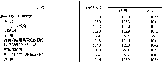 市場物價溫和上漲。居民消費價格總水平比上年上漲2.0%,其中城市上漲1.8%,農村上漲2.5%。商品零售價格指數(shù)上漲1.2%。農業(yè)生產(chǎn)資料價格指數(shù)上漲3.6%。工業(yè)品出廠價格指數(shù)上漲1.0%。原材料、燃料、動力購進價格指數(shù)上漲2.6%。固定資產(chǎn)投資價格指數(shù)上漲1.5%。土地交易價格指數(shù)上漲5.0%。房屋銷售價格指數(shù)上漲4.3%,房屋租賃及物業(yè)管理價格指數(shù)分別上漲3.1%和0.9%。農產(chǎn)品生產(chǎn)價格指數(shù)上漲0.2%,其中,谷物上漲1.5%,棉花下降2.5%,油料上漲6.1%,畜產(chǎn)品下降1.3%。