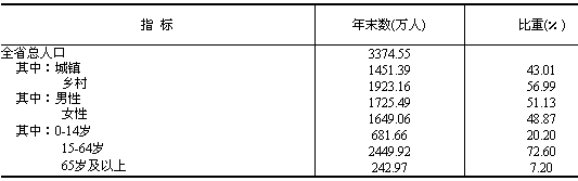 據(jù)2006年人口抽樣調查,年末全省總人口為3374.6萬人,比上年末增加19.3萬人。全年全省出生人口38.6萬人,出生率為11.48‰;死亡人口19.3萬人,死亡率為5.73‰;人口自然增長率為5.75‰。