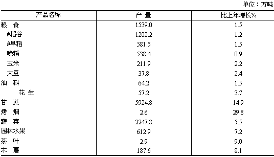 全年糧食種植面積3326.3千公頃,比上年減少24.6千公頃;油料種植面積311.9千公頃,減少2.2千公頃;甘蔗種植面積838.4千公頃,增加90.8千公頃;蔬菜種植面積1131.8千公頃,增加37.4千公頃;桑園面積111.2千公頃,增加27.5千公頃;烤煙種植面積15.9千公頃,增加2.0千公頃。 全年糧食產(chǎn)量1539.0萬(wàn)噸,比上年增加22.7萬(wàn)噸,增產(chǎn)1.5%;油料產(chǎn)量64.2萬(wàn)噸,增產(chǎn)1.5%;甘蔗產(chǎn)量5924.8萬(wàn)噸,增產(chǎn)14.9%;蔬菜產(chǎn)量(含菌類)2247.8萬(wàn)噸,增產(chǎn)5.5